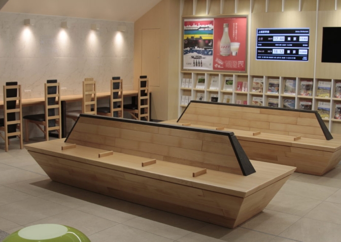 「座にいがた MI nA TO」(皆とつくる、交流と憩いの港。)がコンセプトの新潟駅在来線待合室に家具を製作しました。