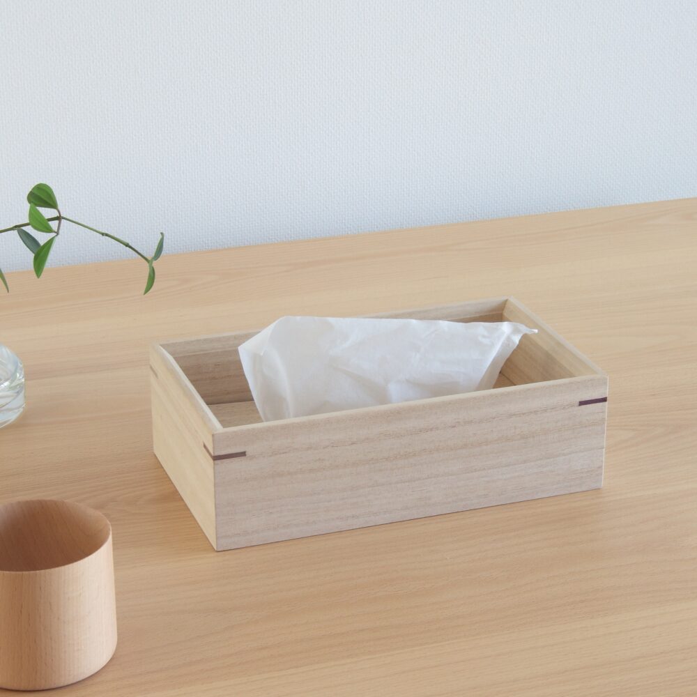 ソフトパックティッシュが入るケースで、中身が減ると蓋が下がっていく構造です。